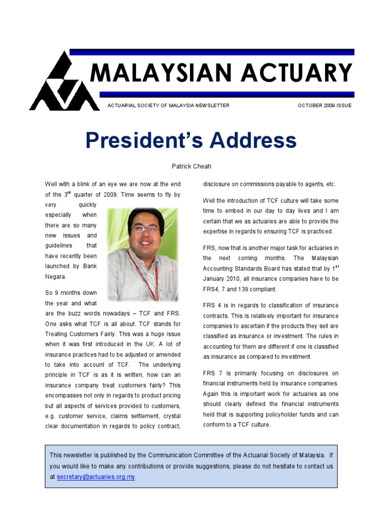 Actuarial Society Of Malaysia Octnewsletter Actuary Insurance