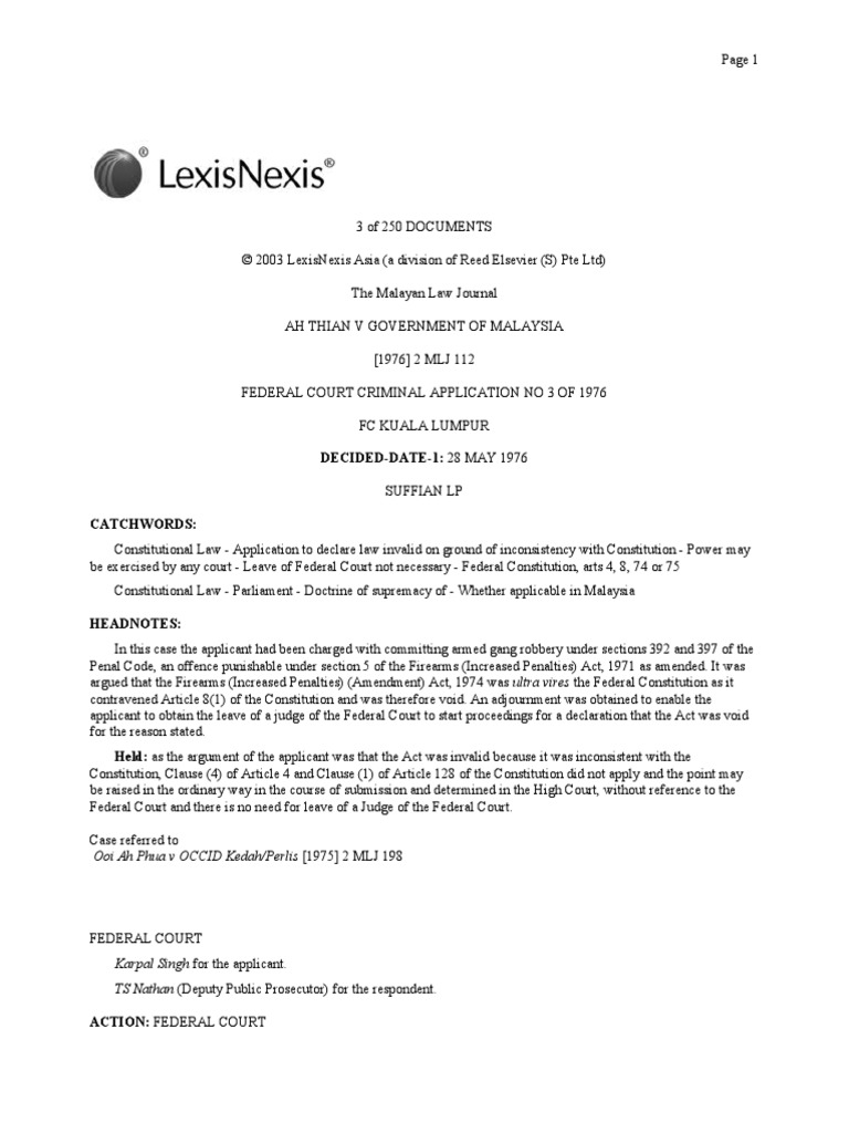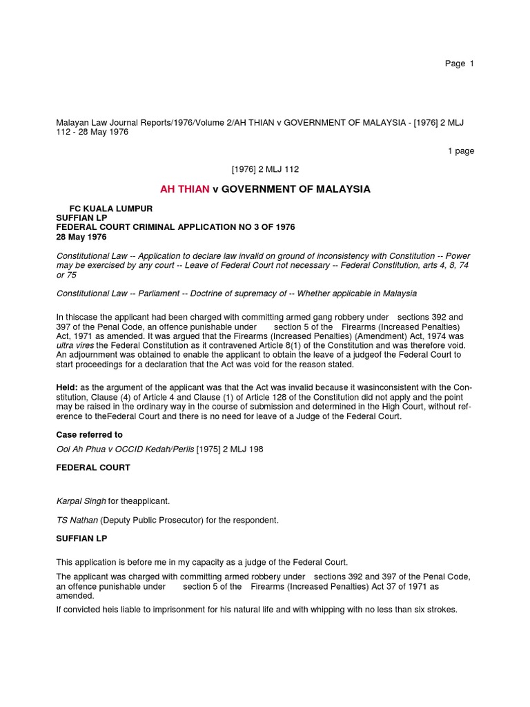 Here we have a written constitution the power of parliament and of state legislature in malaysia is limited by the constitution and they cannot make any law they please the supremacy of the fc is set out in articles 4 1 and 162 6 and section 73 of the malaysia act 1963. 3 of 250 documents 2003 lexisnexis asia a division of reed elsevier s pte ltd the malayan law journal ah thian v government of malaysia 1976 2 mlj 112 federal court criminal application no 3 of 1976 fc kuala lumpur decided date 1. This is to ensure that no adverse ruling is made without giving the relevant government an opportunity to argue to the contrary. Government of malaysia 1976 the apex malaysian court had already declared that the doctrine of parliamentary supremacy as practised in the uk does not apply in malaysia because of the existence and supremacy of the malaysian written constitution.