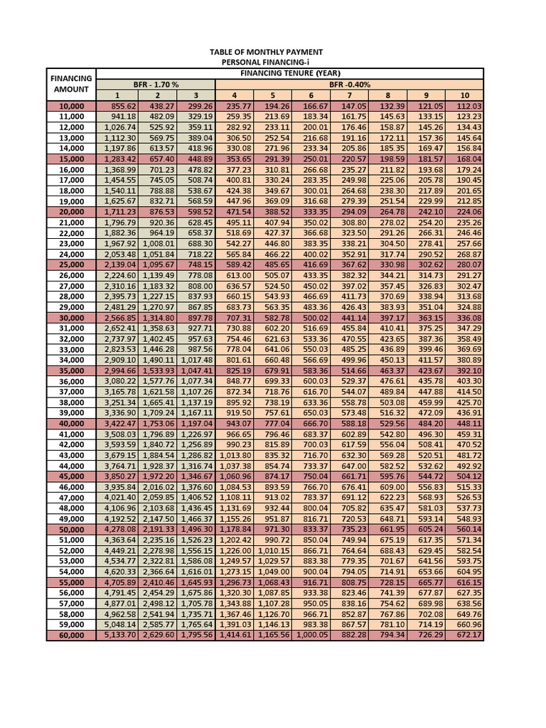 Personal loan interest rate monthly installment payment chart table. The loan table up to 10 years and rm100 000. Personal loan bank islam. Personal financing for professional program.