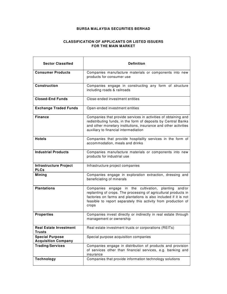 Bursa malaysia sector classification. Cimb 1023 main cimb group holdings berhad. Malaysiastock biz is a free channel for you to access the klse market watch information covered from market summary overview top volume top gainers top losers and up to each categories and individual listed company. The new sector classification is intended to ensure bursa malaysia s sector and sectorial index continued to appropriately represent the global equity markets and enable asset owners asset. Sector sub sector definition bursa malaysia sector classification of applicants or listed issuers 7 plantation 7 1 plantation companies engaged in the cultivation planting and or replanting of crops 8 property 8 1 property companies that invest in real estate through development investment and ownership including real estate service providers such.