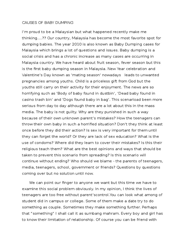 Causes of baby dumping. Causes of baby dumping one of the causes of baby dumping is teenagers are lack of sex education. Among the causes of baby dumping were unwanted pregnancies and teenage pregnancies. Baby dumping is a social crisis and has a chronic increase as many cases are occurring in malaysian society there are many ways to prevent baby dumping as it is an irresponsible did. Steps must be taken for unwanted pregnancies provide assistance to parents in crisis and increase communication within families and communities.