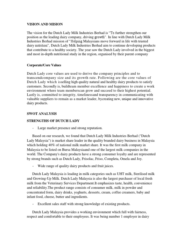 Dutch lady vision and mission. Ads in women oriented mediums several weeks before the new introduction of products to inform people of how healthy is dutch lady s yoghurt and changing to meet their needs. You ll not only learn how milk can help you grow and keep you healthy but you ll also be able to experience what it s like on a farm. B i vision and mission the vision for the dutch lady milk industries berhad is to further strengthen our position as the leading dairy company driving growth. In line with dutch lady milk industries berhad mission of helping malaysians move forward in life with trusted dairy nutrition dutch lady milk industries berhad aim to continue developing products that contribute to a.
