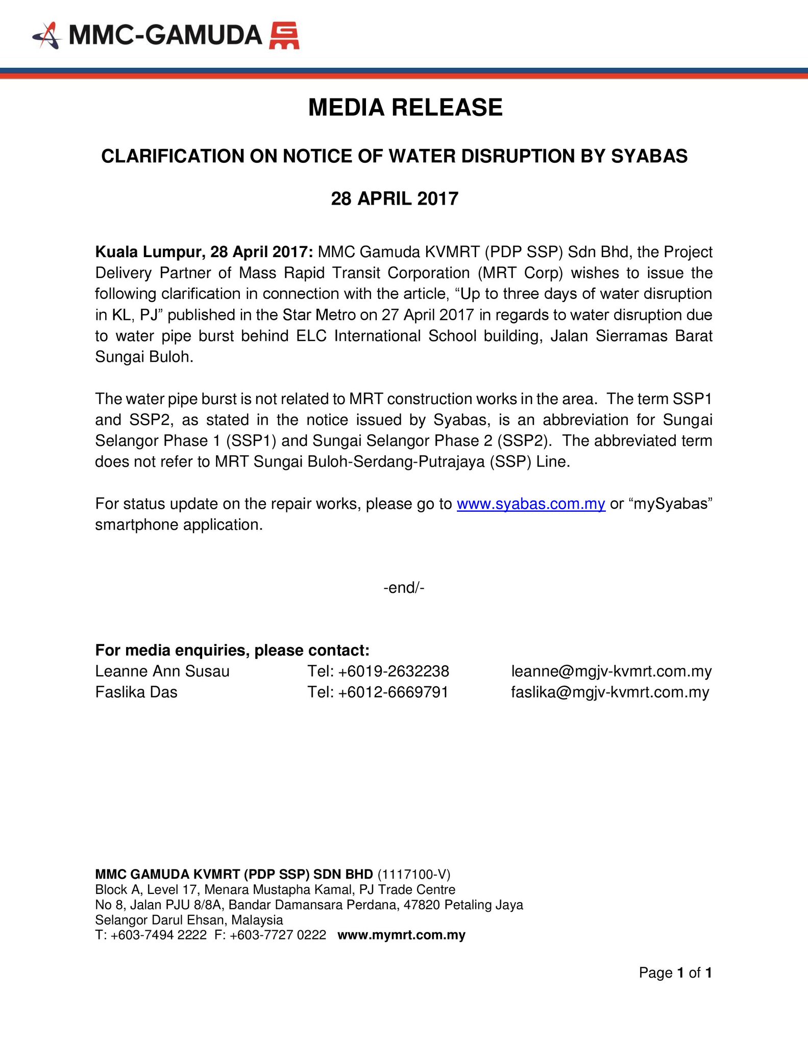 Mrt Corp On Twitter Media Release Mmc Gamuda Kvmrt Pdp Ssp Sdn Bhd Clarification On Notice Of Water Disruption By Syabas