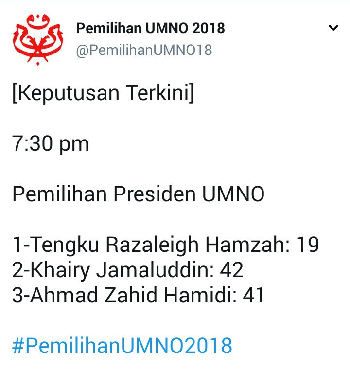 Buletin Tv3 On Twitter Kj Mendahului Pemilihan Umno Sebagai Presiden Keputusan Terkini Pemilihan Umno Setakat Jam 7 30 Malam Menunjukkan Khairy Jamaluddin Mendahului Dengan 42 Undi Manakala Datuk Seri Ahmad Zahid Hamidi Memperoleh