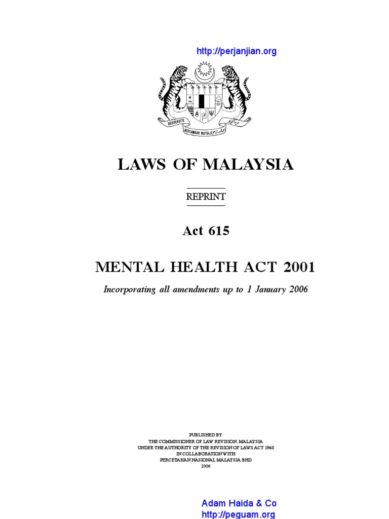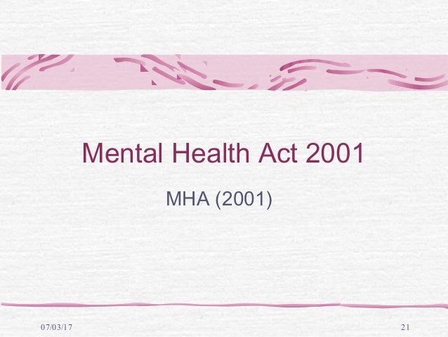 The mental health act 2001 is relevant with the current development in psychiatry health care and keeps abreast with the socioeconomic development of the country. 1 this act may be cited as the mental health act 2001. Section 4 of the mental health act 2001 8. It is prepared by the law reform commission in accordance with its function under the law reform commission act 1975 3 1975 to keep the law under review and to undertake revision and consolidation of statute law.