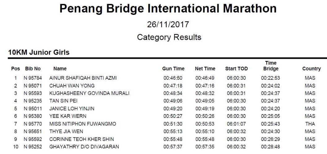 Is the largest online destination dedicated to running fitness and healthy lifestyle in southeast asia. Penang bridge international marathon 2017 top 10 result date. 10km 21km and 42km check result here more photos here. Posted on november 27 2017 november 27 2017 by penang marathon full marathon women s open rank 7 is.