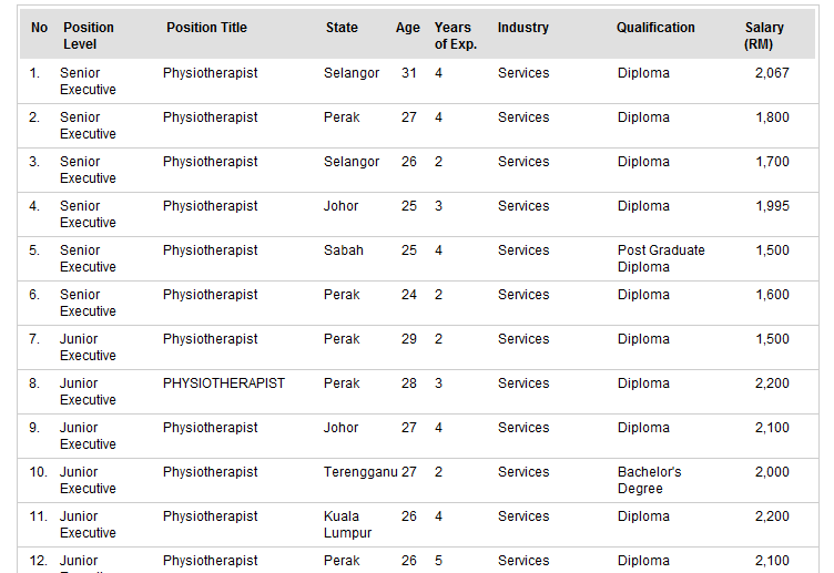 Scam spam expired broken link duplicate. The average salary for a physiotherapist in malaysia is rm 27 736. Visit payscale to research physiotherapist salaries by city experience skill employer and more. The average salary for a physiotherapist in malaysia is rm 30 423.