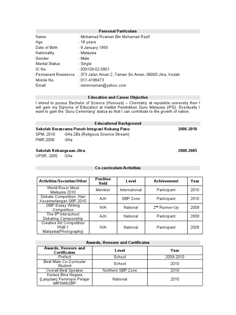 Contoh Resume Lepasan Spm Ringkas Simple Terbaik