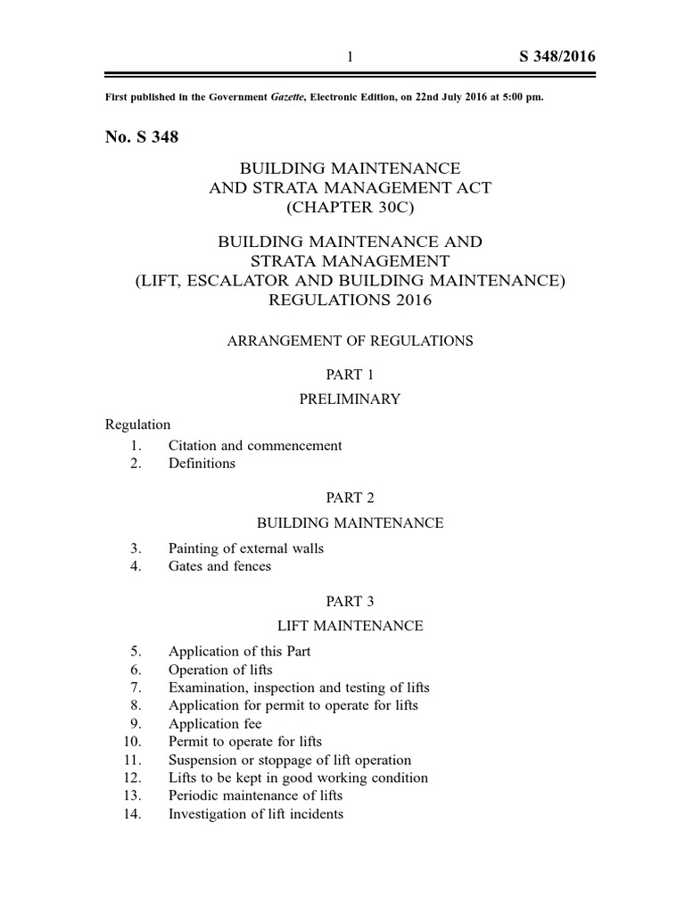 No S 348 Building Maintenance And Strata Management Act Chapter 30c Building Maintenance And Strata Management Lift Escalator And Building Maintenance Regulations 2016 Elevator Business
