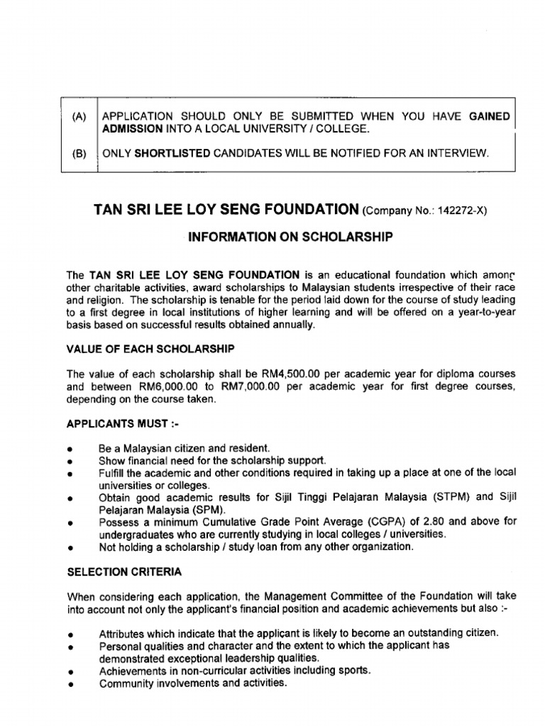 Afterschool My The Tan Sri Lee Loy Seng Foundation Is Inviting Scholarship Applications From Malaysian Citizens Pursuing Diploma Or Degree Courses In Local Public Institution Of Higher Learning Or University In Malaysia