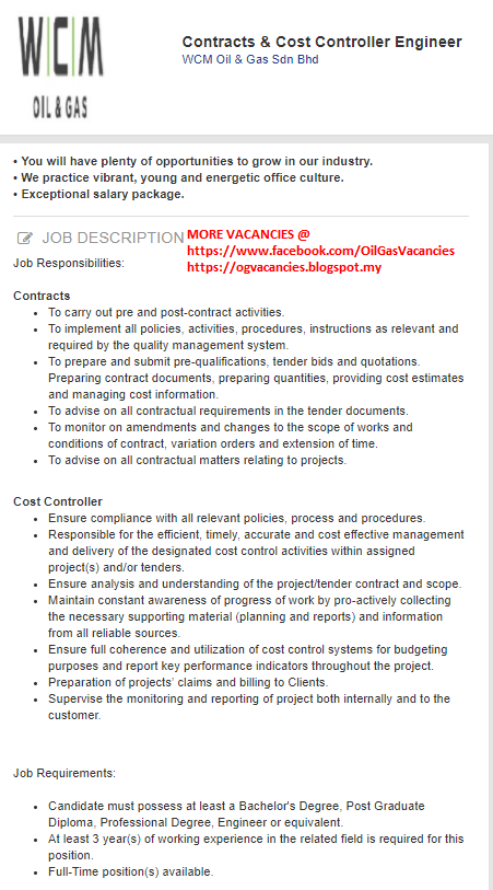 Oil Gas Vacancies Contracts Cost Controller Engineer Wcm Oil Gas Selangor